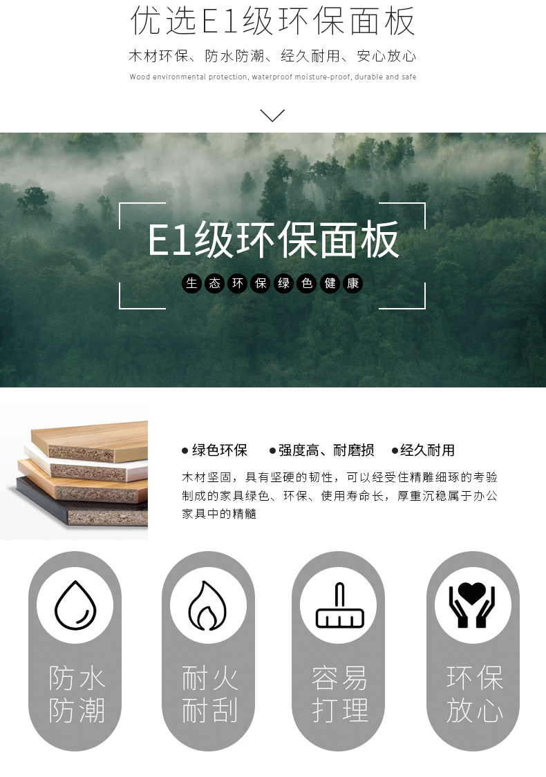 基 材:E1級達歐洲環(huán)保標準基材(目前國內(nèi)辦公家具行業(yè)板式基材標準較高的),此基材用原木壓縮顆粒成型,甲醛含量小于1.2MG/L,具耐磨、抗刻劃、耐高溫、易清潔、耐酸堿等優(yōu)點,經(jīng)防蟲、防腐處理,表面握釘力及靜曲強度均達到國家標準;抗彎性能強,不易變形。